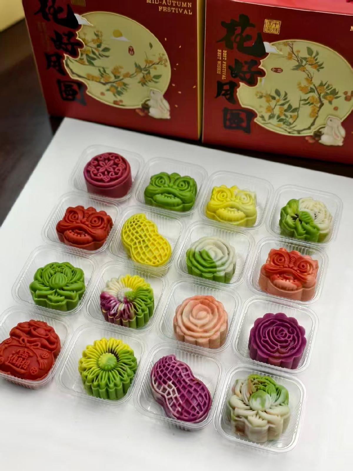 学院全体教职工与学生代表共30人齐聚一堂,通过亲手制作冰皮月饼,以独特的方式共庆团圆、同贺华诞。在专业烘焙师指导下,师生们戴上手套,兴致勃勃地投入冰皮月饼制作。揉面团、包馅料、压模具……看似简单的步骤却充满乐趣。教职工与学生们分组协作,有人专注手法,有人创意点缀,现场欢声笑语不断。当一个个印有“花好月圆”“国泰民安"字样的冰皮月饼从模具中诞生时,师生们纷纷举起作品合影,记录下这温馨瞬间。“第一次和老师们一起做月饼,感觉特别温暖!”2304班胡环举着刚做好的莲蓉月饼笑着说。