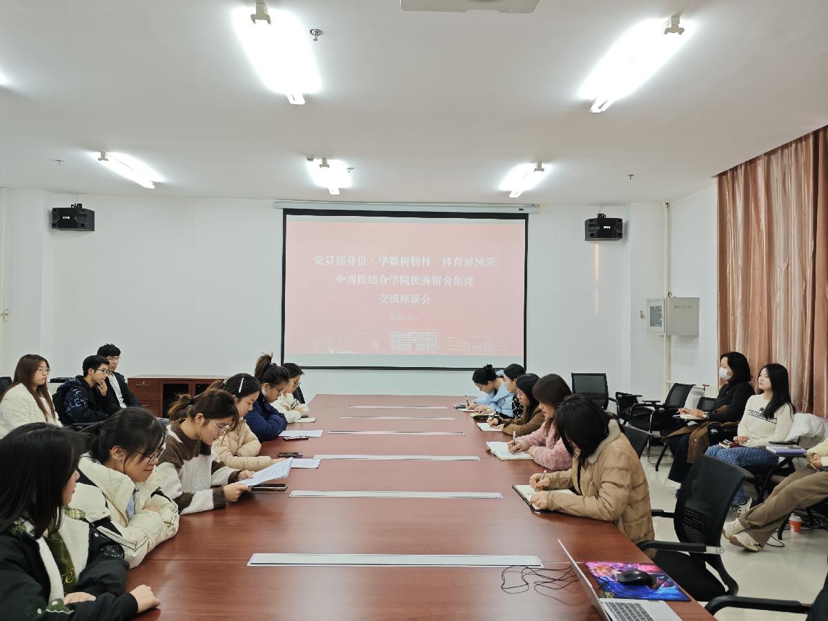 12月4日下午,中西医结合学院在5605会议室举办“党员亮身份・学霸树榜样・体育展风采”优秀宿舍创建交流座谈会。学院党委书记董芳、党委副书记刘海燕、副院长郑园,全体辅导员、优秀宿舍及各年级学生代表参会。会议由辅导员马聪敏主持。