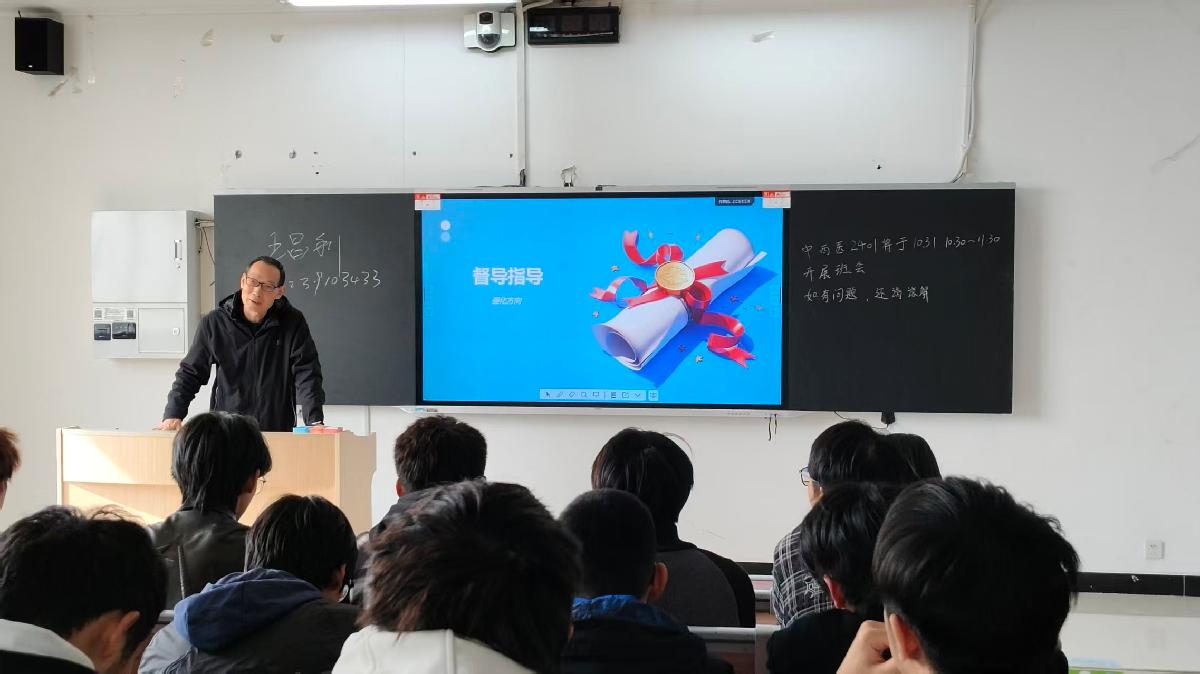 班会上,王昌利老师系统总结班级学习共性问题,深入阐释中西医专业学习核心要义与发展前景。他寄语学生:一要锚定中西医基础,摒弃偏科,以“双轨学习”思维关联中西医知识,研读经典与教材,夯实专业根基;二要打通理论与实践,通过医院见习、科研项目参与、校园实践活动,让理论贴合临床需求,尽早培养临床思维;三要养成系统学习习惯,通过制定阶段性目标与月度计划、活用多元学习资源、组建互助学习小组,高效攻克难点;四要坚守初心,正视学习困难与外界误解,以对专业的热爱与敬畏砥砺前行。